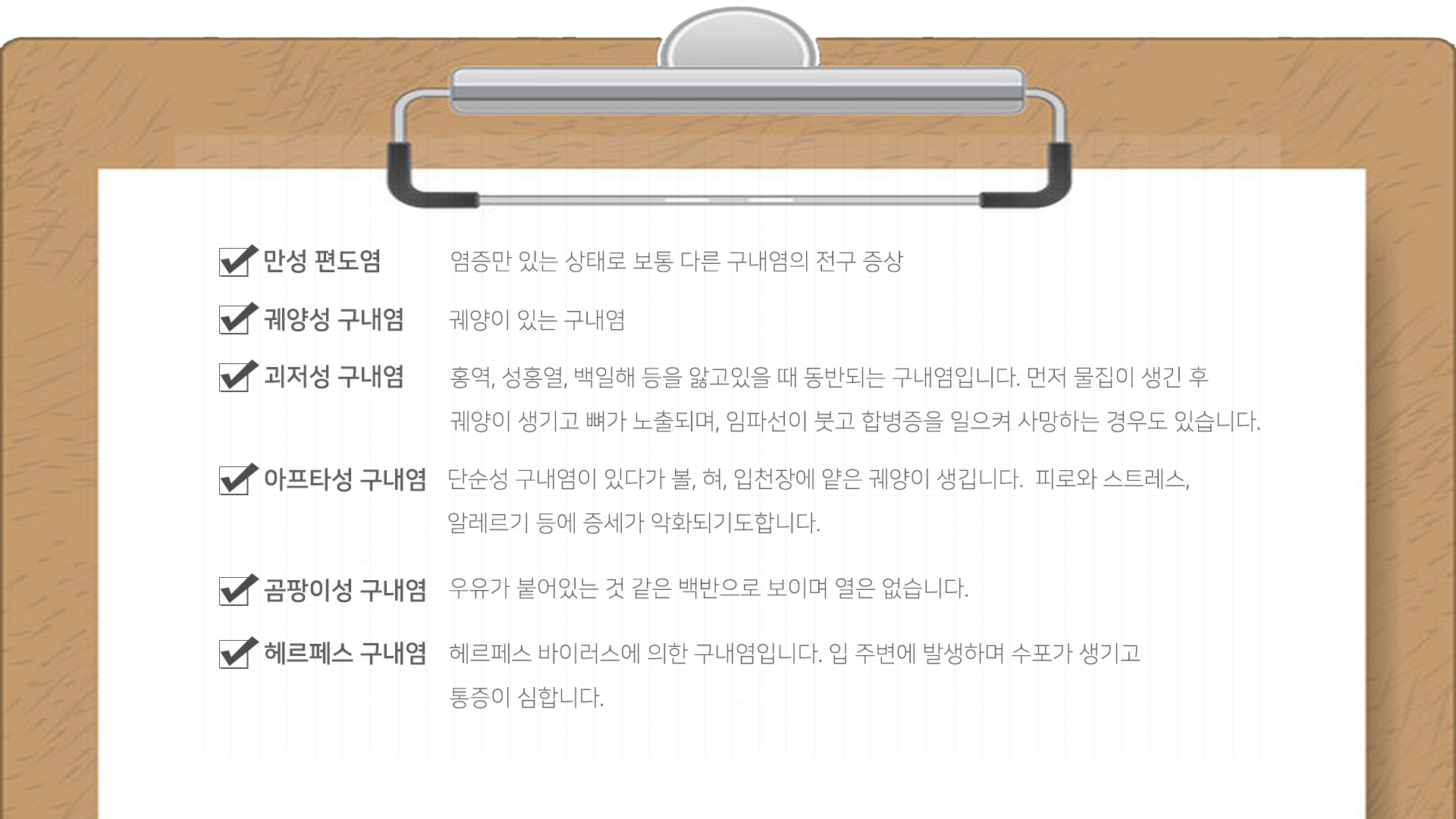 ±¸°Á¡¸·Àº ½ÅüÀÇ ¿ÜºÎ¿Í ³»ºÎ¸¦ ¿¬°áÇÏ´Â À§Ä¡¿¡ ÀÖ¾î ½ÅüÀÇ ³»ºÎÀû º¯È¿Í ¿ÜºÎÀû ÀÚ±ØÀ¸·ÎºÎÅÍ ¸ðµÎ ¿µÇâÀ» ¹Þ°í, Àü¹ÝÀûÀÎ °Ç° »óŸ¦ ¹Ý¿µÇϱ⠶§¹®¿¡ Çô¿Í ±¸°Á¡¸·ÀÇ °Ç°»óŰ¡ Àü½Å °Ç°ÀÇ °Å¿ïÀ̶ó°íµµ ÇÕ´Ï´Ù. ±¸°Á¡¸·¿¡ ³ªÅ¸³ª´Â ¿©·¯ Áúȯ ¹× ±¸³»¿°ÀÇ ¿øÀÎÀ» Á¤È®ÇÏ°Ô ¾Ë ¼ö´Â ¾øÁö¸¸, ½ºÆ®·¹½º, ÇÇ·Î, È£¸£¸ó º¯È, »ý¸®ÁÖ±â, °©ÀÛ½º·¯¿î üÁß º¯È, ºñŸ¹Î B12 °áÇÌ, öºÐ°ú ¿±»ê °áÇÌ, ¸é¿ª·Â ÀúÇÏ µîÀÌ ¹ßº´¿¡ ¿µÇâÀ» ¹ÌÄ¡´Â °ÍÀ¸·Î ¾Ë·ÁÁ® ÀÖ½À´Ï´Ù. ÀÌ ¿Ü¿¡µµ º¼À» ¾Ã°Å³ª, À½½ÄÀ̳ª ¾Ë·¹¸£±â, Ä¡¾à ¼ººÐ µîÀ¸·Î ÀÎÇØ ±¸°Á¡¸· ÁúȯÀÌ ¹ß»ýÇÒ ¼ö ÀÖ½À´Ï´Ù.